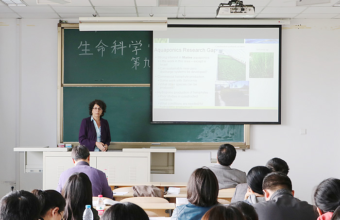 4月13日下午,应我院邀请,美国南佛罗里达州立大学土木与环境工程学院教授、博导萨瑞娜·埃尔加斯(Sarina J. Ergas)来院访问,并为学院教师和研究生作了题为“Resource Recovery Through Halophyte Production in Marine Aquaponics”的学术报告。报告会由姚登兵院长主持。埃尔加斯教授介绍了如何利用植物水培系统对海水养殖水体进行循环处理,在净化水质、保障养殖对象生长的同时,收获耐盐水培蔬菜,提升海水养殖系统的经济效益与环境效益,推动海水养殖业可持续发展。