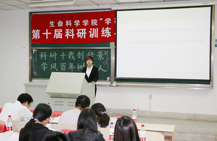 本次大赛共有《绿茶中茶多酚对茶叶中细菌的抑制作用》、《迷迭香酸的提取及其抑菌性的验证》、《苯酚糊剂致大鼠血瘀型输卵管阻塞性不孕症模型制作》、《南美白对虾白斑病毒检测-巢式PCR技术》等九组课题进入决赛。决赛分为ppt展示与问题答辩两个环节。在ppt展示环节,选手们本着科学严谨的态度用简明易懂的语言呈现课题实验,深深吸引了现场观众;在问题答辩环节,面对评委们的专业提问,选手们做了精彩的回答,赢得阵阵掌声。最后《链霉菌基因敲除后的定位》、《棉花黄萎病抗性鉴定及指纹图谱》课题组获得一等奖。