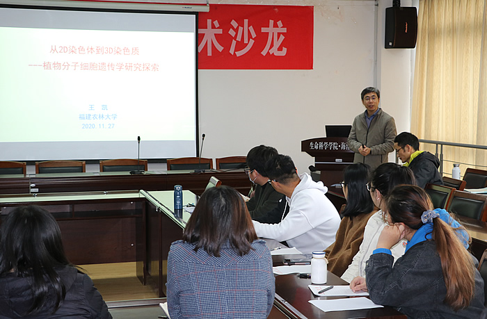 11月27日,福建农林大学博士生导师王凯教授来学院做了题目为“从2D染色体到3D染色质-植物分子细胞遗传研究探索”专题学术报告。