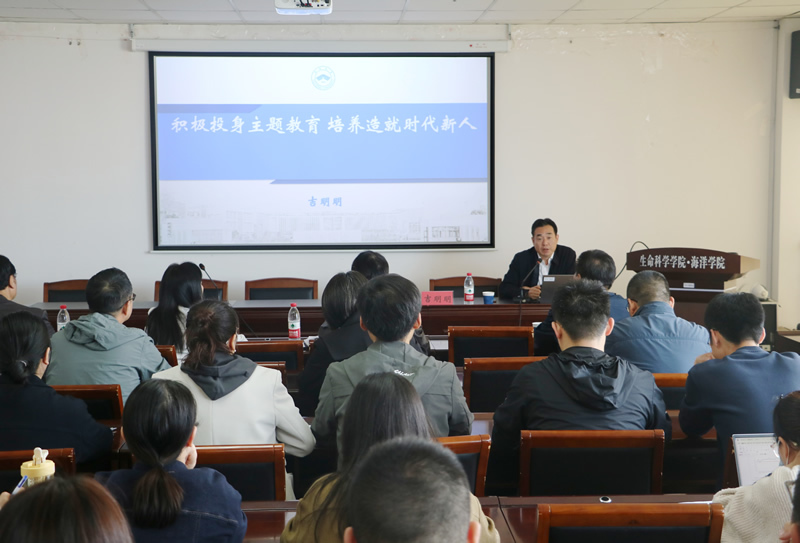 吉明明以《积极投身主题教育 培养造就时代新人》为题,介绍了主题教育“学思想、强党性、重实践、建新功”的总要求,全面系统解读了习近平新时代中国特色社会主义思想的科学体系、精髓要义、实践要求,重点讲述了新形势下如何做好高校意识形态工作等。他希望全体师生党员带着嘱托学、带着感情学、带着责任学,扎实开展理论学习、调查研究、检视整改等,以高质量的学习成效有力推动学院高质量发展。