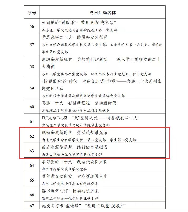 近日,省委教育工委公布江苏高校2021—2022年度党建工作创新奖和2022年度最佳党日活动优胜奖评选结果。全省共有178项党建工作创新、189项主题党日活动参评,经各高校党委推荐专家组评审和厅专题办公会议研究,评选出江苏高校2021-2022年度党建工作创新奖100项、2022年度最佳党日活动优胜奖158项。其中,我院教工第二党支部、学生第二党支部“砥砺奋进新时代,劳动筑梦最光荣”获最佳党日活动优胜奖。