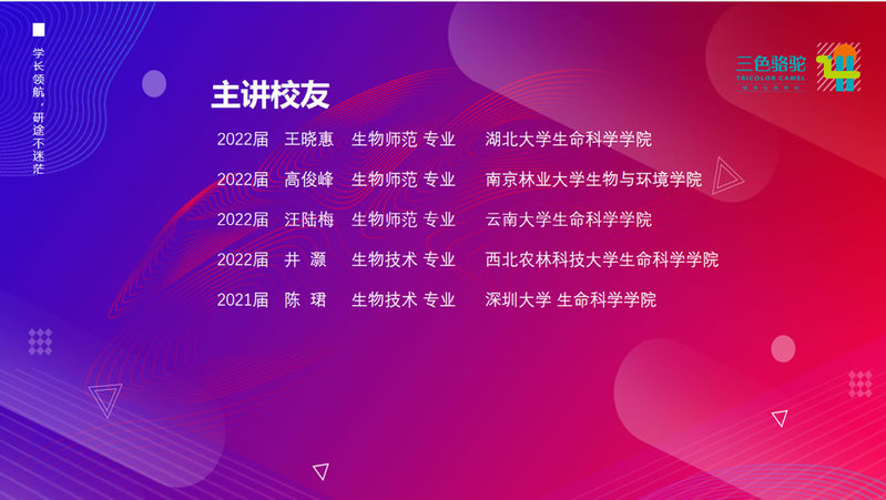本次分享会邀请了来自南京林业大学、湖北大学、云南大学、西北农林科技大学、深圳大学的5位我院毕业优秀校友,为学弟学妹们传授考研经验。成功上岸南京林业大学的高俊峰从目标院校选择、考研时间线、备考方法等方面分享了自己的考研经验;湖北大学的王晓惠和云南大学的汪陆梅从考研与就业的选择、考研动机、考验心态、参考书目选择、信息资料收集等方面进行了详细的讲解;深圳大学的陈珺和西北农林大学的景灏从应试技巧、报考专业前景、英语和政治的学习等方面为学弟学妹制定了学习计划,还分享了考研调剂的心得。会后,同学们和学长学姐就考研中的相关问题进行了热烈的交流讨论。