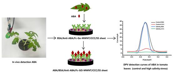 脱落酸ABA是一种重要的植物激素,参与调节各种生理过程,包括种子休眠、胁迫反应和发育生长,原位实时监测ABA在植物体内的动态变化可以促进对ABA作用机制的理解。本研究开发了一种新型的电化学免疫电极系统,用于直接检测植物体内的ABA的含量。该系统由液体碳胶、二茂铁-氧化石墨烯-多壁碳纳米管纳米复合材料和 ABA 特异性抗体修饰构建的一次性不锈钢片电极,使得ABA的检测范围为 1 nM 100 μM,检测限低至 100 pM,并实现高盐胁迫下的番茄叶片中ABA的原位检测。原位检测获得的ABA水平与参与ABA生物合成的2个特异性基因SlNCED1SlNCED2的表达相关,这一结果表明该系统在研究ABA调控机制的准确性和潜在的应用价值。本研究的电化学免疫电极系统提供了一种可靠灵敏的ABA原位检测方法,为探索ABA在植物生理和胁迫响应中的复杂调控作用提供了新的策略,推动精准农业的发展。文章一经发表,受到了Natural Science News 的关注,并以题为Detecting Plant Hormone in Tomato Leaves Using a Simple Stainless Steel Sensor对文章进行了评论(https://naturalsciencenews.com/article/5840)