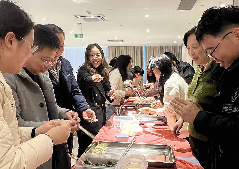 随后大家齐聚食堂,伴随着优美的迎春序曲,用双手包出美味的饺子,传递冬日温情。活动现场,老师们一改平日站在讲台上的端庄形象,纷纷化身美食达人,满怀热忱地投入到包饺子活动中。一连串动作如行云流水,一个个饱满可爱的饺子便在指尖 “诞生”。老师们一边专注于手中的创作,一边还开启了热烈的交流模式,欢声笑语此起彼伏,让整个食堂都沉浸在欢乐的海洋之中。